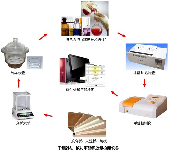 主要原理是將一定暴露面積的試件放在清潔的乾燥器的支架上,乾燥器底部盛有一定數量的蒸餾水。試件在規定環境中放置一定時間,然後對水進行分析得出甲醛含量。結果稱“乾燥器法甲醛釋放量”(簡稱“乾燥器值”),單位為mg/L。
