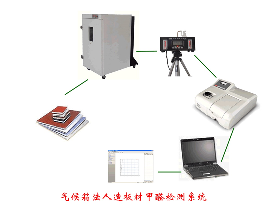 將樣品放入溫度、相對濕度、空氣流速和空氣置換率控制在一定值的氣候箱內。樣品中的甲醛釋放出來與箱內空氣混合,定期抽取箱內空氣,通過盛有蒸餾水的吸收瓶,將甲醛全部溶入水中;測定吸收液中的甲醛量及抽取的空氣體積,計算出每立方米空氣中的甲醛量, 其單位是mg/m³。